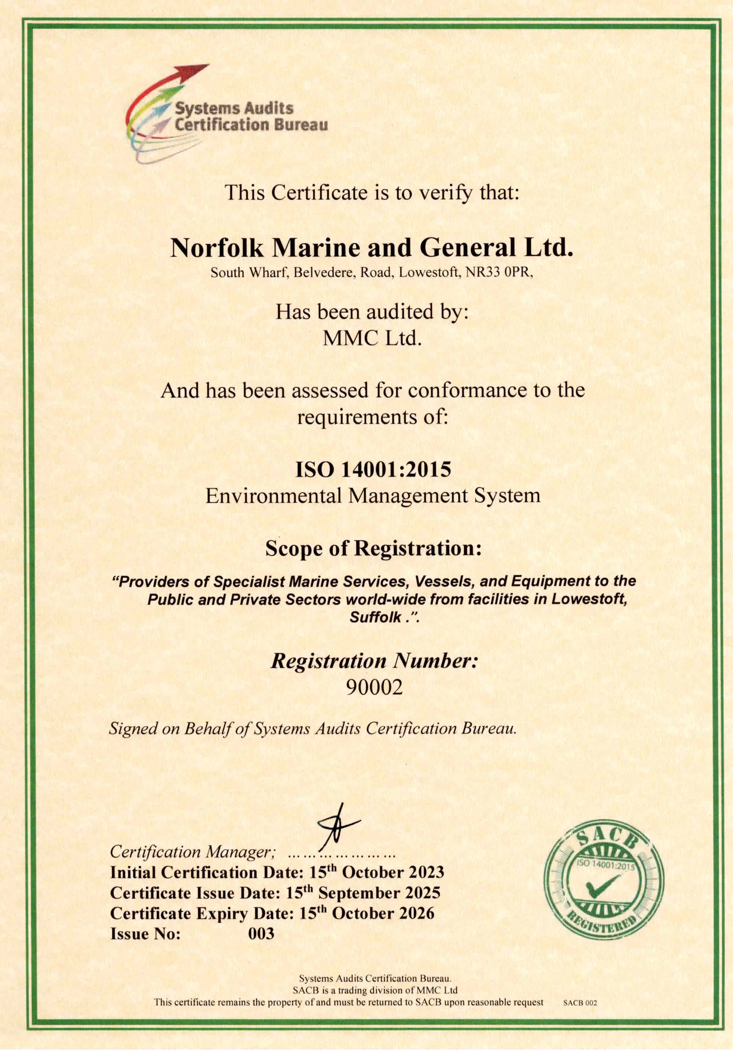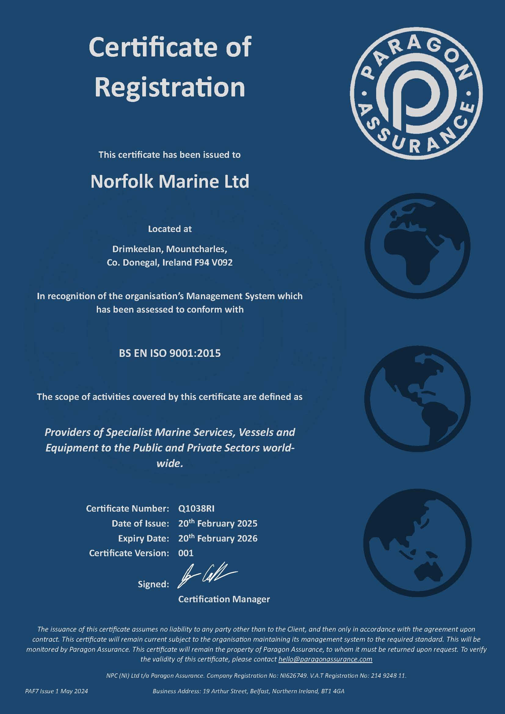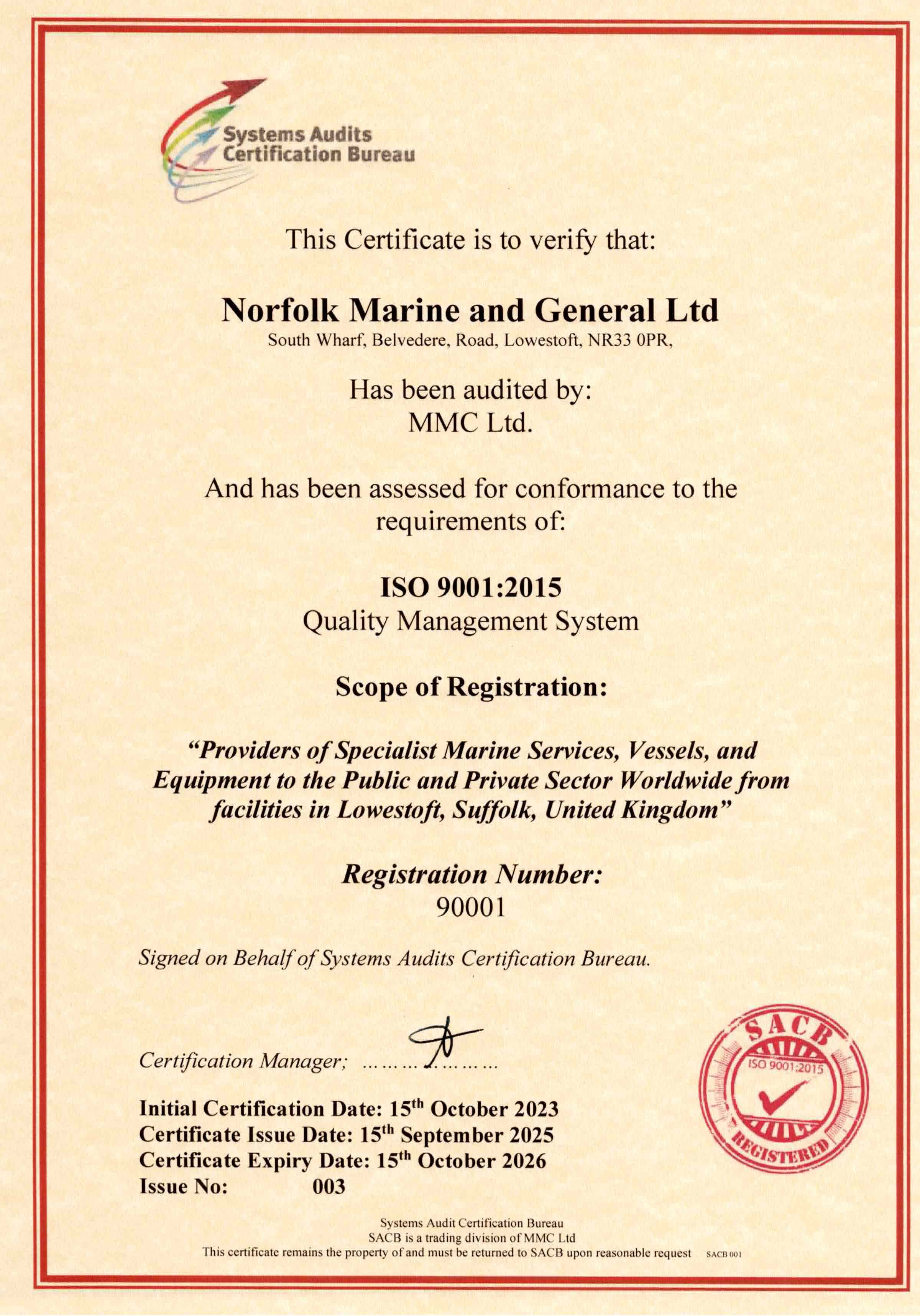 At Both Norfolk Marine Ltd & Norfolk Marine & General Ltd, we prioritize quality in every facet of our operations, and our ISO 9001:2015 certification is a testament to this commitment. This internationally recognized standard signifies our dedication to establishing and maintaining a robust Quality Management System (QMS). Through systematic processes, continual improvement, and a focus on meeting and exceeding customer expectations, we ensure that our marine engineering solutions adhere to the highest standards of quality, reliability, and customer satisfaction